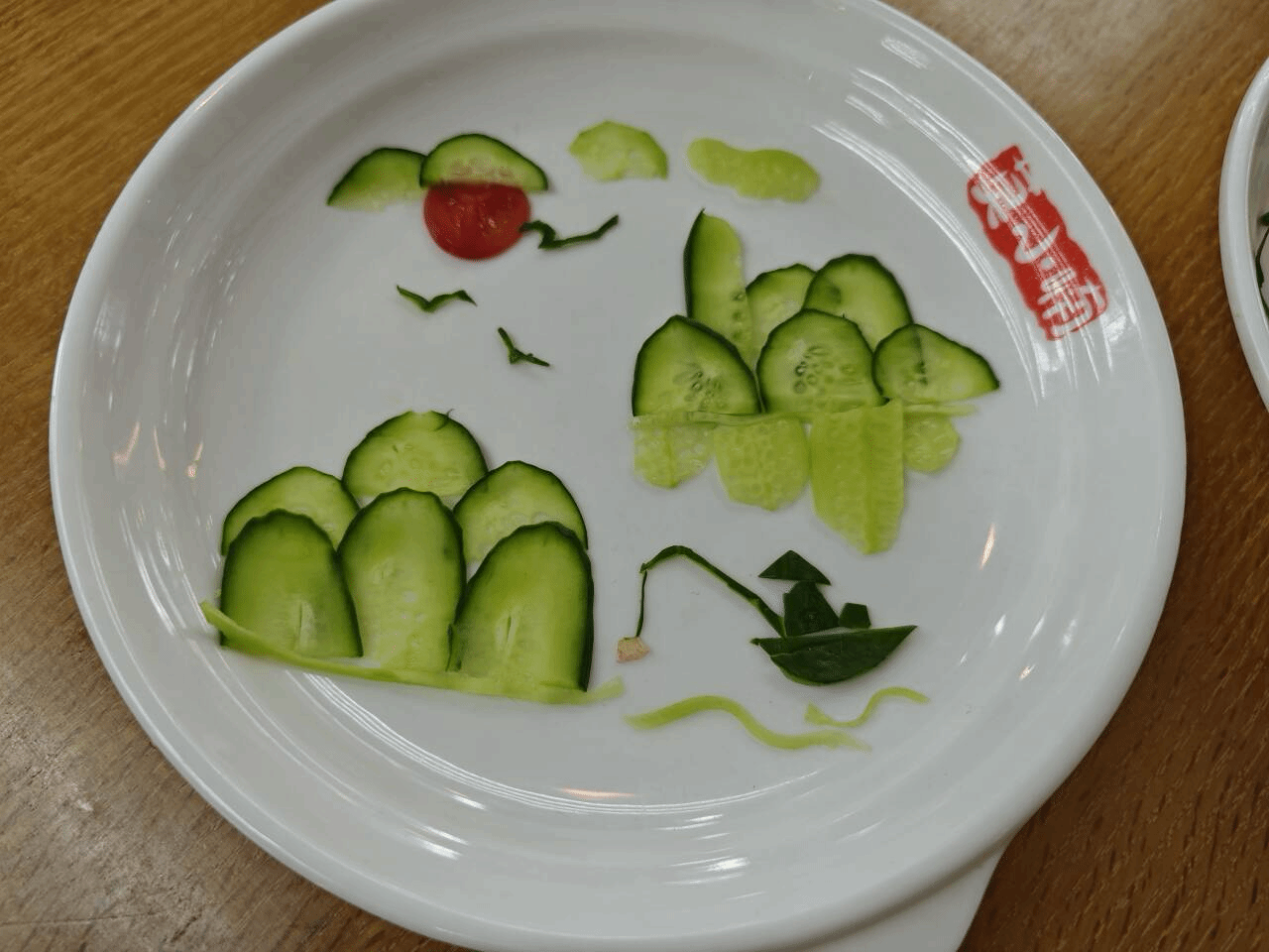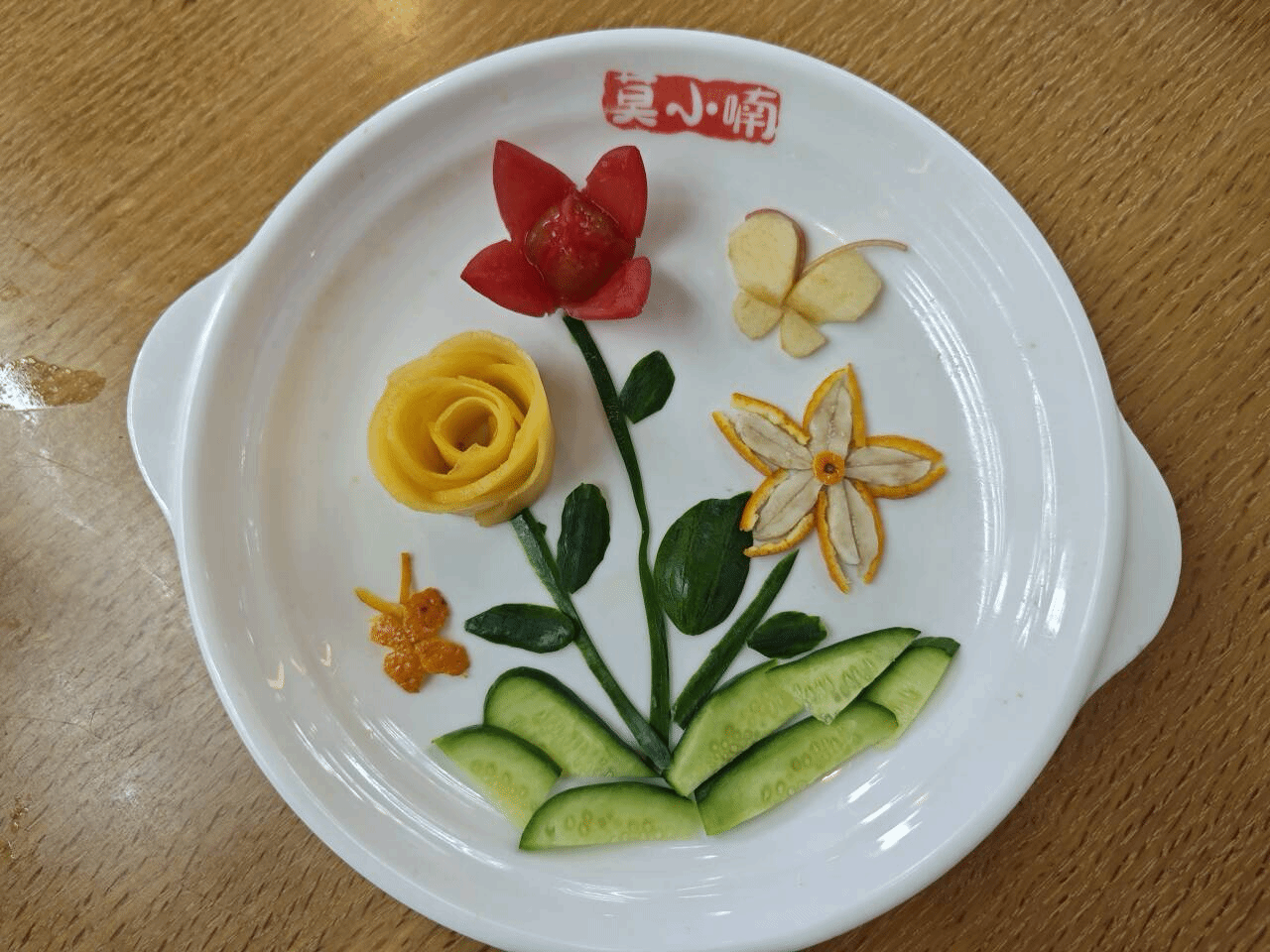 在水果拼盘设计环节中,食堂里“热闹非凡”。员工们在手机上搜索水果拼盘图片,并与拥有的材料进行对比,确定拼盘图案后,进行分工合作。经过切割图形、雕刻图案、精心摆盘等步骤,一件件艺术品“新鲜出炉”,“麦当劳薯条”、“郁金香”、“天鹅”……不同的水果拼盘形象纷纷呈现在盘子中。