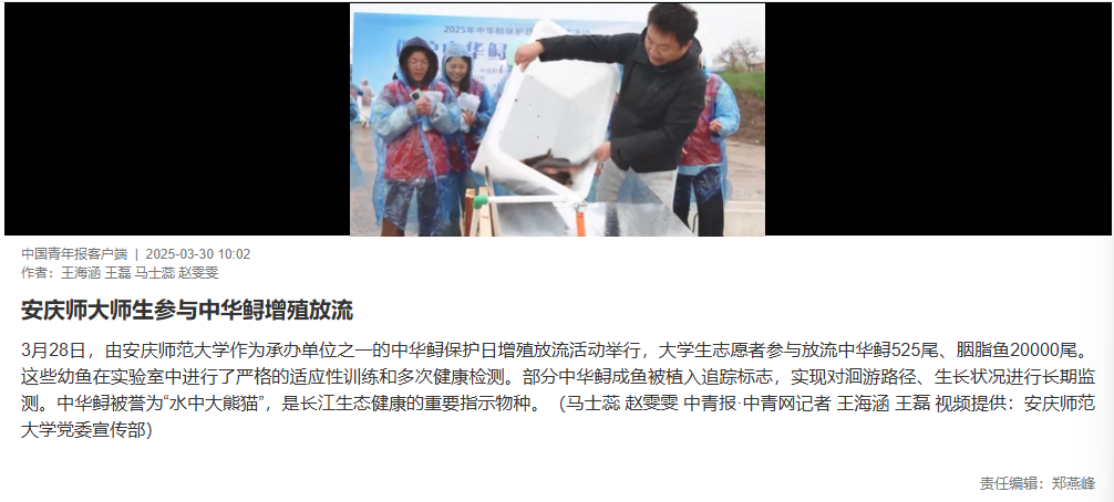 3月28日,由必一运动公司作为承办单位之一的中华鲟保护日增殖放流活动举行,老员工志愿者参与放流中华鲟525尾、胭脂鱼20000尾。这些幼鱼在实验室中进行了严格的适应性训练和多次健康检测。部分中华鲟成鱼被植入追踪标志,实现对洄游路径、生长状况进行长期监测。中华鲟被誉为“水中大熊猫”,是长江生态健康的重要指示物种。(马士蕊 赵雯雯 中青报·中青网记者 王海涵 王磊 视频提供:必一运动公司党委宣传部)