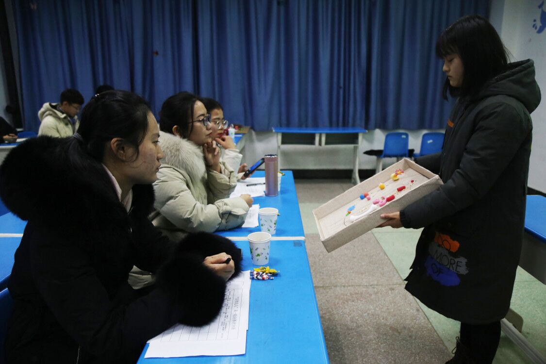 “从上往下依次是DNA、DNA缠绕在组蛋白上组成核小体……”生物科学专业2020(5)班王婉婷正在介绍一组染色体结构模型,该模型用彩色橡皮泥、钢丝、牙签等材料制作而成,小组成员先捏出核小体、染色质、双螺旋结构,再用钢丝、牙签把它们串成一整个染色体,让微观世界变得宏观。“染色体结构模型深化了我们在高中学习的生物知识,比较适合向同学们科普。”