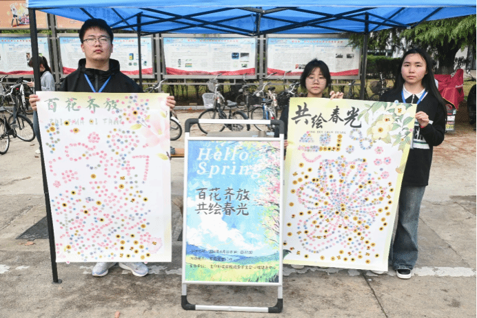 随着活动的进行,原本空白的展板版面渐渐变得五彩斑斓,形成了两幅独具匠心的拼贴作品。通过拼贴画的形式,春花之美在展板上有了具体的呈现,两幅锦绣缤纷的春日画卷被众多参与者拍照留存。