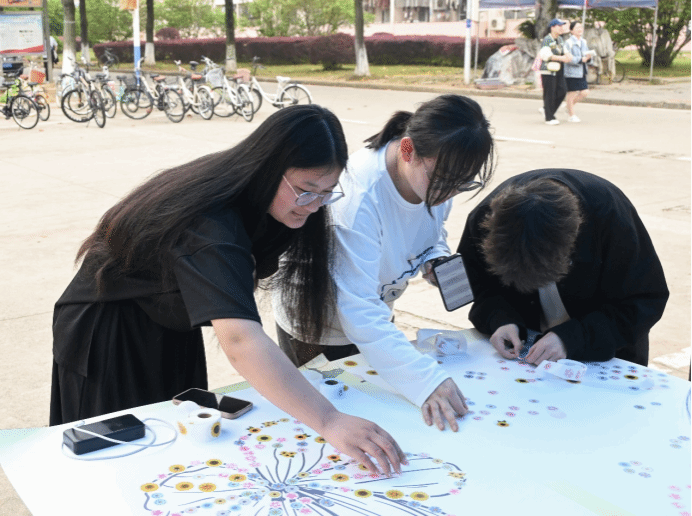 “我们用一朵朵小花拼成了一束大花,感觉十分有趣。”数学与应用数学专业2020(5)班的芮瑞感叹。平时就擅长手工的她,和好友在“百花齐放”展板前精心挑选贴纸,合作拼贴出一朵花的图案,“以花绘花”的创作吸引了许多员工驻足观看。临走前,芮瑞用手机记录下了这一色彩纷繁的“花朵”。