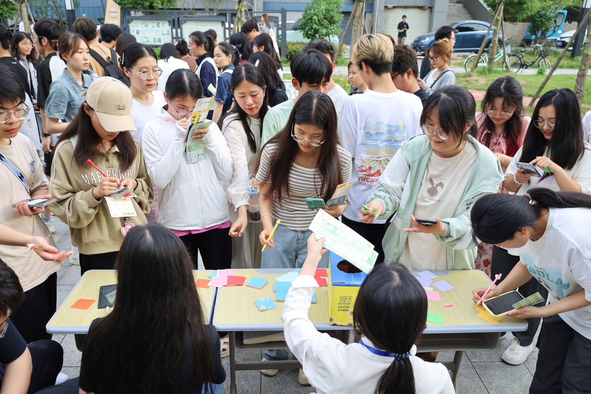 “压花书签”摊位前人头攒动,法学类专业2023(1)班的葛芯怡手持一个植物标本“举棋不定”,在工作人员和周围参与员工的帮助下,她成功将透明书签封口并匹配流苏挂上展示台。“这对我来说是一次全新的体验,在同学们的帮助下,我鼓起勇气去尝试,挑战了自我。”葛芯怡感叹,自己性格非常腼腆,总是害怕犯错,但今天的活动让她看见了与平常不同的自己。