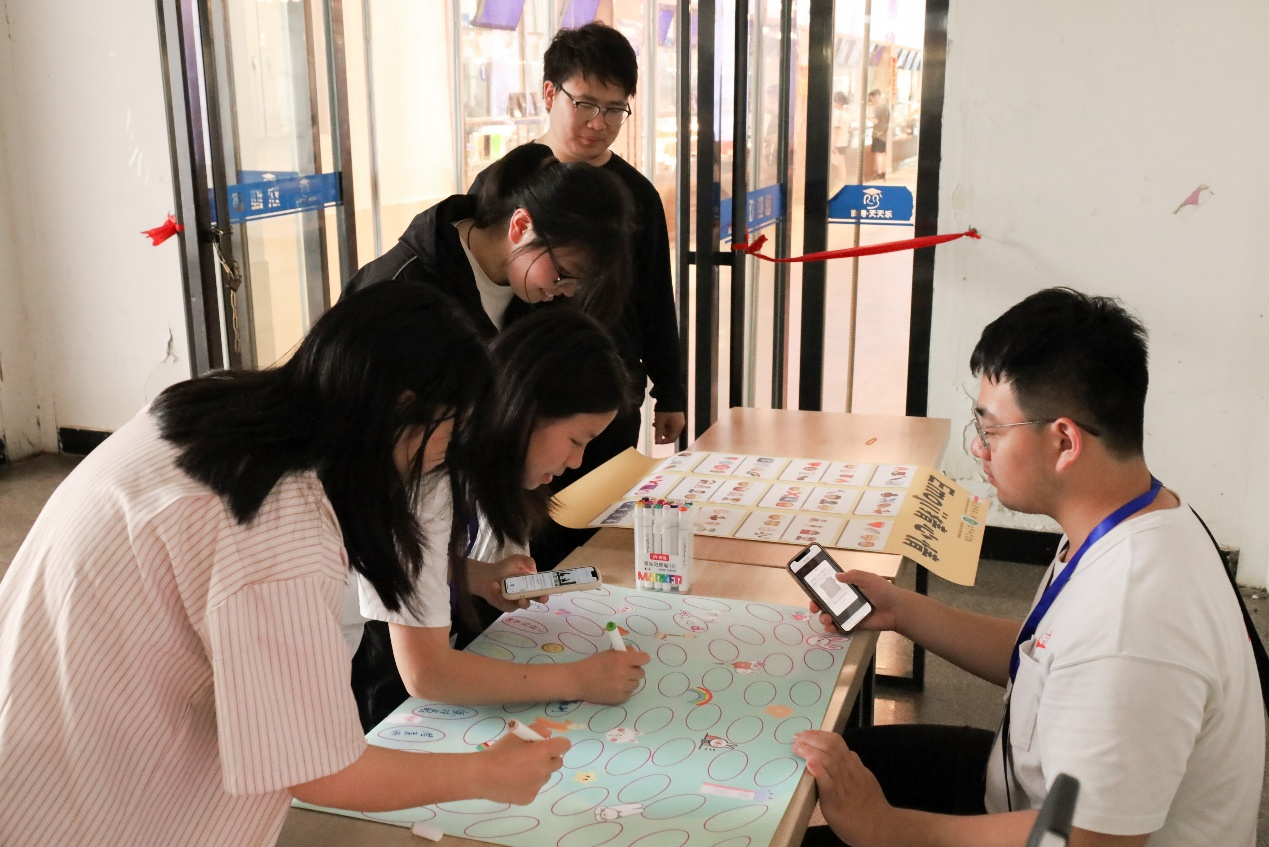 生物科学类专业2024(2)班的赵蕾在笑脸、向上指的手、玫瑰和火焰这个心情宫格前驻足良久。“笑上玫红是什么呢?”她疑惑地问。“笑脸是喜悦的心情,火焰正在燃烧,可以往这个方向猜测。”工作人员、生物科学类专业2024(4)班的方雅丽轻声提示。“是喜上眉梢!”赵蕾表示,虽然她的答题之路不是很顺畅,但当她成功猜出这个成语时,喜上眉梢就是她的心情缩影。