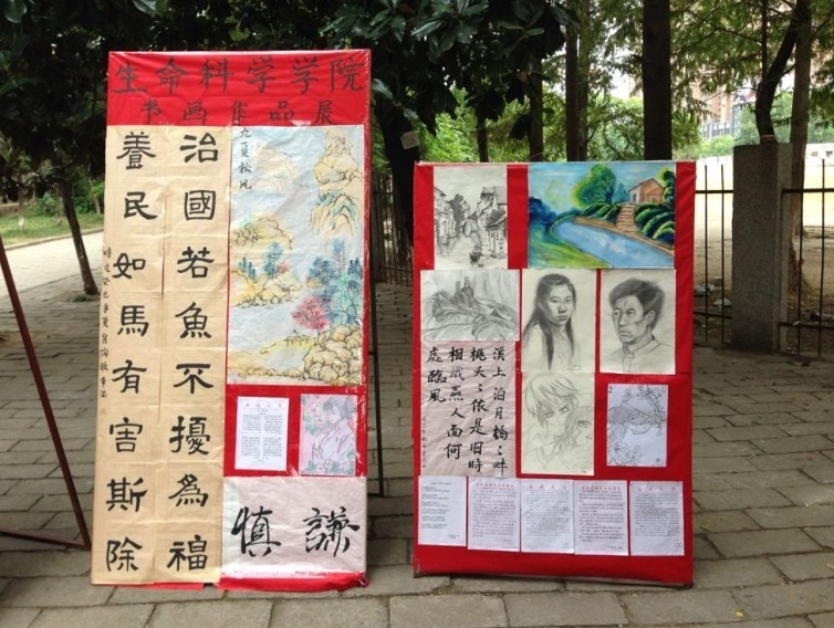 2013年9月29日中午,经过院员工会宣传部的精心评选,一批书画精品终于在菱湖校区31栋宿舍楼前展出,期间吸引了路过的众多同学驻足观赏。本次书画大赛共征集了近百幅作品,分书法和绘画两个大类,分别有楷书、行书、隶书、水墨画、油彩画、素描、硬笔书法等各种形式作品,其中不乏优秀作品,如12级园林的裴文静同学的水彩山水画及11级生科1班的汪语梵同学的硬笔楷书,都给同学们留下了深刻的印象。