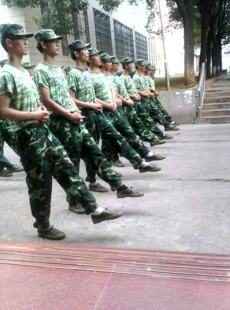 在教官的严格指导下,13级新生军训第一天进行了军姿训练,立正稍息、齐步走。烈日骄阳下,要绷紧全身,笔直的站立三四十分钟并不是件容易的事情。“不一会儿,腿就开始僵硬,身体来回倾斜。最受罪的就是腿脚了,每天都会酸疼。”4连的一位男生说道。“站军姿的时候就想蹲着,练习蹲姿的时候就想站着,其实都一样难坚持,腿都会很疼。”6连的一位女同学笑着说。训练的时候教官会照顾一些体质较弱的同学,但总有嫌累的同学想趁机偷懒,却还是躲不过教官的“火眼金睛”,绝不给任何一个偷懒者机会。军训是苦的、累的,同样也是充满快乐的——在休息间歇,严格的教官也变得可爱起来,教员工唱起《军中绿花》、《团结就是力量》等高亢的军歌,和同学们做起了游戏,甚至还应男生的要求教他们擒拿术······操场上到处飞扬的歌声,呐喊声,欢笑声,凝聚成一首充满青春活力的特殊旋律。