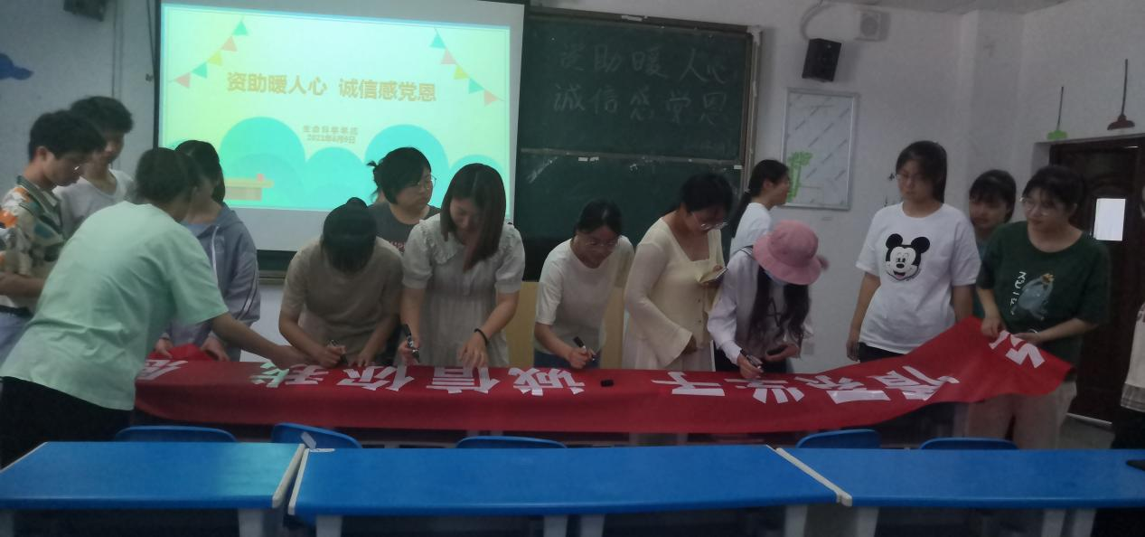 活动最后,所有同学积极主动在“爱心助学 情系学子 诚信你我 感恩社会”资助诚信宣传横幅上签名。
