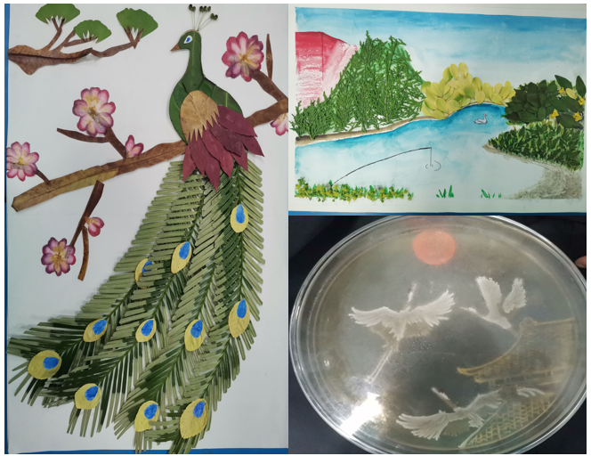 选手们以“生物”为素材进行创作。有的团队以培养皿为画布,微生物为“颜料”,勾勒出一副精美的《故宫祥鹤图》;有的团队用苏铁、冬鹃等材料剪裁拼接出一只绚丽的孔雀;作品《木之语》让枯木枝叶重新组合,让他们再次焕发生机,诉说自己的故事……。校园中随处可见的花草枝叶、实验室中培养的微生物,经过他们的设计和创造,以或平面、或立体、或多彩、或生动的“艺术品”的形式展现在观众眼前。最终第五组作品——《锦天绣地》获得评委们的一致好评,斩获一等奖。