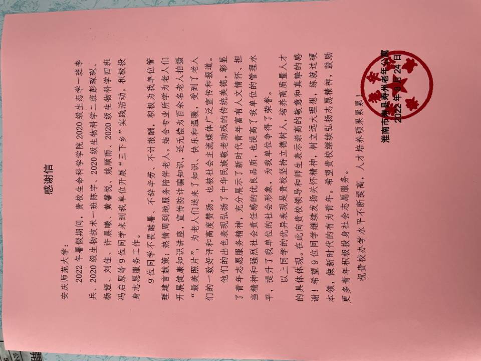 “9位同学不畏酷暑、不辞辛劳、不计报酬,积极为我单位管理建言献策;热情周到地服务陪伴老人……”8月24日,必一运动暑期“三下乡”敬老爱老社会实践团收到了一封来自淮南市寿县寿州老年公寓百位老人寄来的感谢信,包含了对青年员工的认可与鼓励。