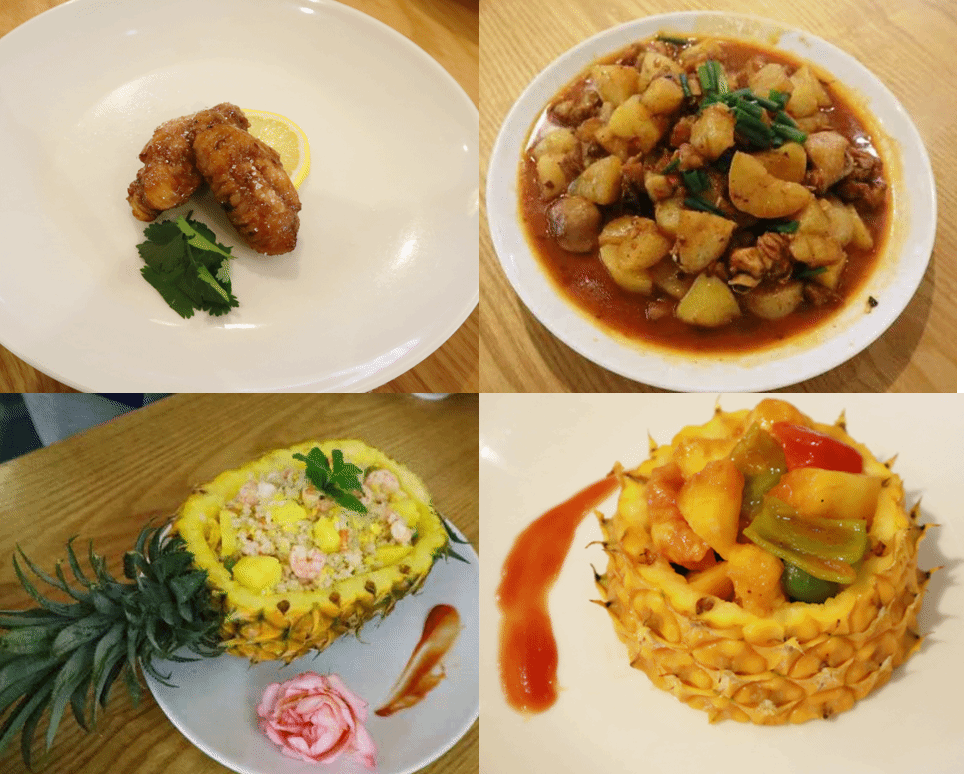 胡萝卜、玉米与饭粒混合翻炒,半颗菠萝挖空当作碗碟,生物科学类专业2022(8)班的吴静怡团队所做的菠萝炒饭一经出场,便吸引了不少员工的注意。由于外型酷似海绵宝宝的家,她和队友便为这道菠萝炒饭起名为“菠萝屋”。谈及想法来源,吴静怡表示,由于队伍成员喜欢吃菠萝,就将做菜和饮食习惯结合了一下。“我很享受做菜的过程。”