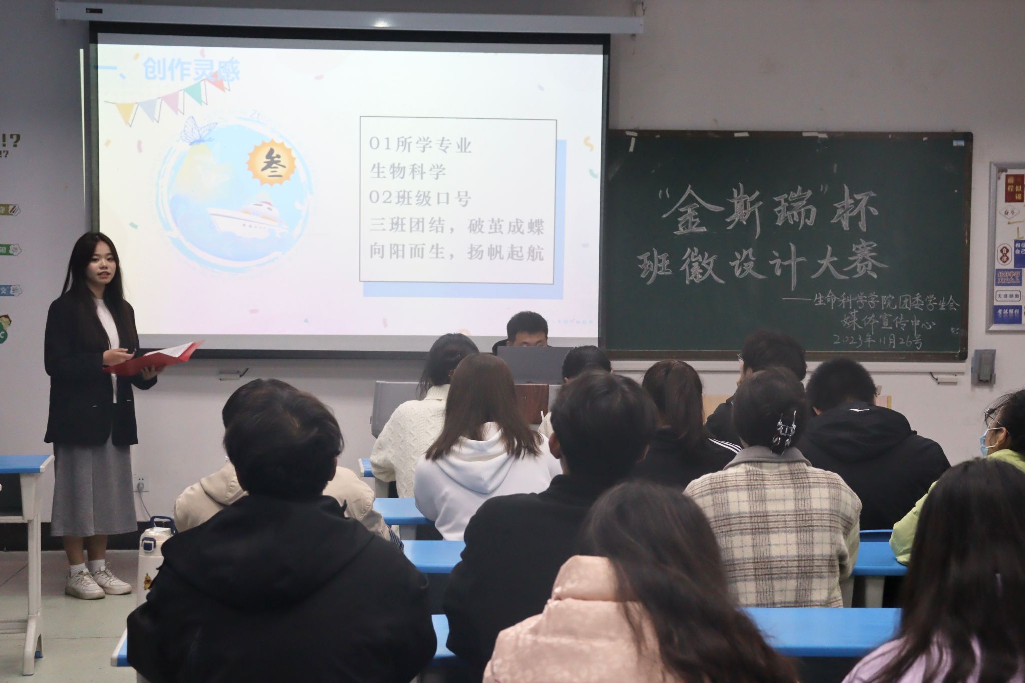 本次活动分为线上比拼和线下汇报,经过同学们几天的努力,一幅幅精美的班徽设计图展现在眼前。“在线上投票结果公布后,我们来到了各组ppt汇报的现场”本次活动的负责人,22级生科四班的陈苑珂表示各班代表轮流上台向我们流利地讲述了班徽设计的过程及寓意,可见同学们对于此次活动的认真与用心。各班班徽的元素组成多种多样,有DNA、兰花、海洋、船帆、麦穗、鲲等。“提到生物,第一个印入脑海的便是DNA的图案了,寓意着科学与研究”2023级生物科学类3班的金乐乐表示,DNA的形态近似于曲折的道路和阶梯,象征着不畏艰险、勇于攀登的精神。而对于鲲鹏展翅的形象,2022级生物技术2班的陈梦阳表示“展翅高飞的鲲喻示着生技二班的同学们将会和这幅画一样一路春风追快马,九州豪杰绘宏图。”