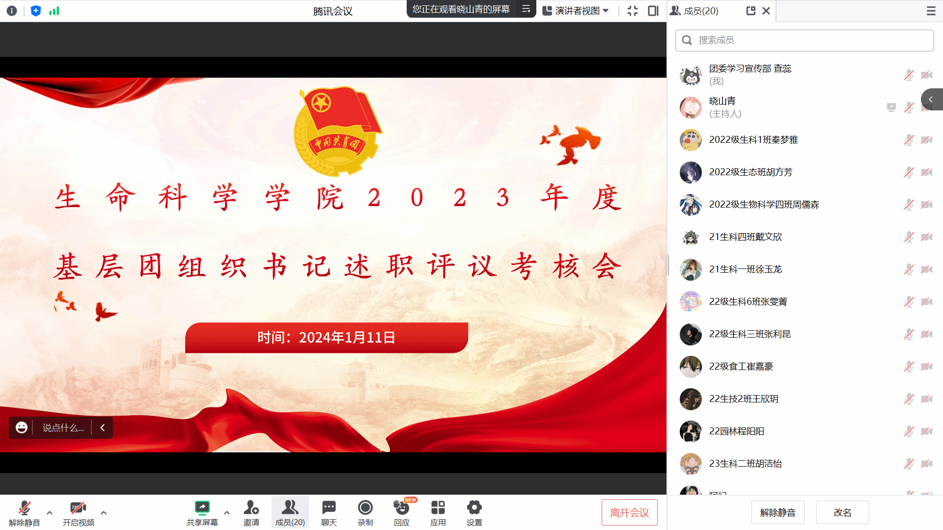 1月11日,必一运动在线上召开2023年度基层团组织书记述职评议考核会,对2022级各班团支部进行现场述职考核,进一步推动基层团组织的组织力、引领力、服务力和大局贡献度协同提升,各班团支书及团委负责人徐启凤参加会议。