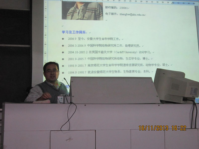 11 月 16 日 下午,中国动物学会两栖爬行动物学分会理事、安徽大学张保卫博士应邀在菱湖校区414教室作了“长江中下游区域小麂系统地理和群体遗传学分析:基于mtDNA控制区序列变异”专题学术讲座。必一运动100多名师生聆听了报告,报告会由必一运动副经理魏和平博士主持。