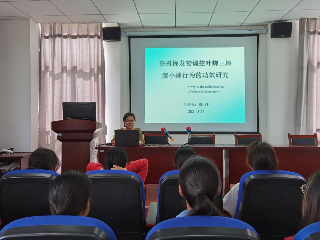 穆丹副教授首先介绍了在自然界中,为防御植食性昆虫的为害,虫害植物释放虫害诱导的挥发性化合物,作为“求救”信号,引诱天敌,从而间接防御害虫。茶树是中国重要的经济作物,在生长过程中易遭受多种害虫为害,尤其是为害幼嫩芽梢部分的害虫。小贯小绿叶蝉是中国茶区为害最严重的害虫之一,长期依靠化学防治,会导致茶叶农残超标,必须开拓绿色防控叶蝉的途径。叶蝉三棒缨小蜂是其卵寄生蜂,对产于嫩茎中的叶蝉卵的寄生率较高,跟随效应显著。如何利用茶树自身释放的挥发物吸引叶蝉三棒缨小蜂间接防御小贯小绿叶蝉,这是一个饶有兴趣的研究。本报告以蝉害茶梢和蝉害茶茎为研究对象,通过GC-MS分析鉴定其挥发物成分,室内四臂嗅觉仪行为测定与茶园挥发物诱集试验相结合,筛选出引诱缨小蜂的最佳挥发物组分,达到以虫治虫的生物防治效果,为高效安全防治小贯小绿叶蝉提供参考。
